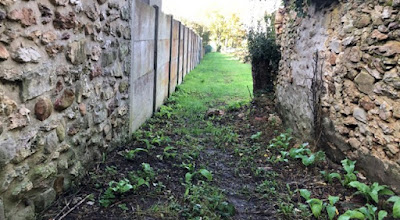 Pour ceux qui ne sont pas allés à la vigne depuis un certain temps (et à qui je déconseille formellement de s'y aventurer sans nécessité absolue), vous trouverez ci-dessus quelques photos de l'état d'avancement du chantier des Pierrottes : un impressionnant bassin de rétention d'environ 20 m x 4 m x 5 m de profondeur a été creusé dans le sentier au-dessus de la vigne afin de recueillir les afflux d'eaux liés aux orages, eaux qui s'écouleront ensuite par une conduite passée sous le chemin des Pleux. Une fois achevé ce bassin sera recouvert par la voie d'accès piétonne. D'énormes camions, pelleteuses et autres engins complètent pour l'instant le paysage mais en début d'année 2025 cette partie du chantier devrait être terminée et la vigne être à nouveau accessible – à pied – par le chemin des Pleux.